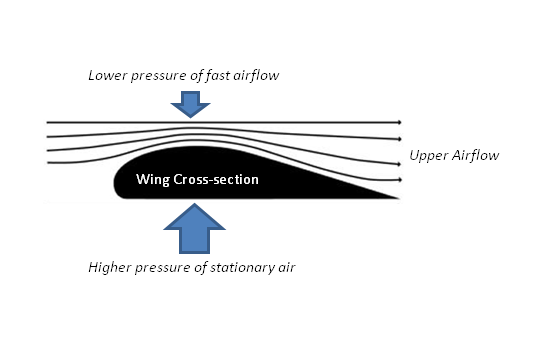 Willard knew that an airplane flies because the stream of air above the wing travels faster than the stream of air below the wing. The difference in speed between the airstreams creates a corresponding difference in air pressure. The pressure below the wing becomes greater than the pressure above the wing, and so it pushes the wing upward. This is called Lift. See Figure 1.