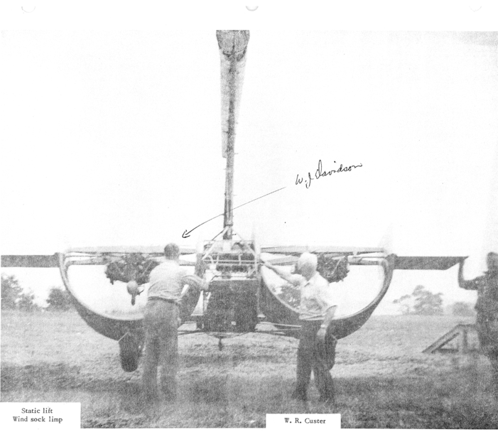 Midday Thursday, December 6, 1951, four men including Walter J. Davidson (as indicated, Figure 5), easily off-loaded the CCW-2, Willard’s second full-size Channel Wing aircraft, down a ramp from the trailer, maneuvered it to the windsock pole, and tied it down. A steel cable extended from above the cockpit and bound the airplane to the pole, its tail pointed inward toward the pole and its nose facing outward. Another cable about five feet long anchored one of the wheels to a twelve-inch metal rod set in the ground.